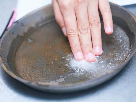 После удаления остатков пищи из ваших кастрюли или другой утвари, хорошо потрите их лимоном. Когда вы видите, что соль потемнела, добавьте еще немного.