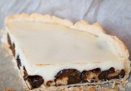 На тесто положите чернослив (можете использовать любые сухофрукты), вылейте творожную массу.