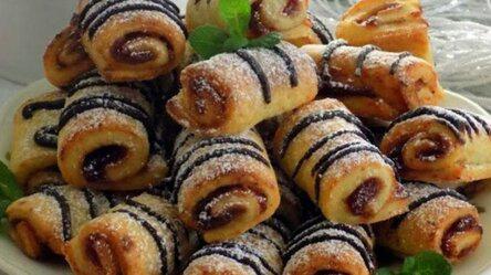 Нам понадобится: Мука пшеничная – 250 г Творог полужирный – 250 г Сливочное масло – 250 г Ванильный сахар – 1 пакетик Яйцо – 1 шт Любимый джем – для начинки Сахарная пудра – для посыпки Тёмный шоколад + чайная ложка сливочного масла – для покрытия
