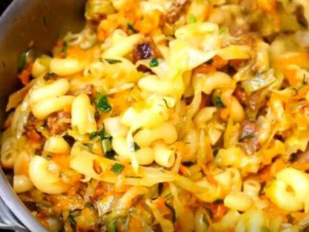 К готовим макаронам добавляем мясо и капусту, все хорошо перемешиваем.