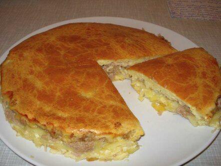 Земесим жидкое тесто половину выливаем в смазанную маслом форму.Сверху положим натертый на крупной терке картофель, затем мелко порезанный лук,затем размятые вилкой рыбные консервы (желательно Сайра) .Заливаем второй частью теста. И в духовку на 40-45 минут.