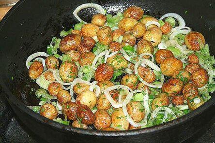 6. Нарежьте лук кольцами, а чеснок мелко нарубите, бросьте их на сковороду за пару минут до выключения картошки.