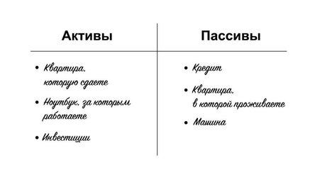 Пассивы — это вещи, которые не приносят доход или увеличивают расход. К примеру, та же самая квартира может быть пассивом, вы же платите за счета. Машина, если вы только ездите до работы и до магазина.