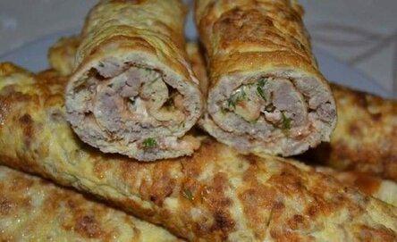1.Сначала надо испечь блинчики. Они пeкутся по одному: вбить одно яйцо в мисочку, добавить столовую ложку молока (или воды), посолить и взбить вилочкой, как на омлет. Пожарить из этого один яичный блинчик.