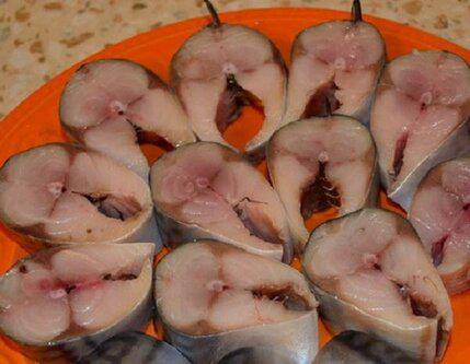 Разморозьте скумбрию, очистите рыбу от внутренностей, удалите голову, филе нарежьте небольшими кусочками.