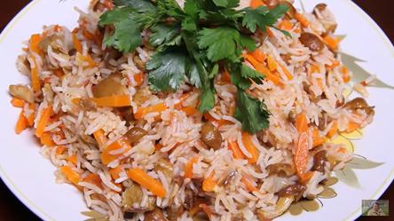 За 3-4 минуты до полной готовности добавьте в блюдо несколько тонких ломтиков сливочного масла, тогда рис получится очень нежным и рассыпчатым, а грибы – мягкими и сочными. Перед подачей тщательно перемешайте, украсьте листьями свежей петрушки.