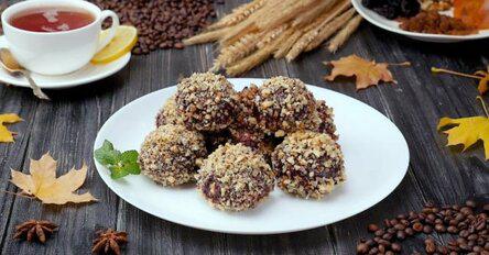 4. 50г грецких орехов, чернослив, изюм и курагу пропустите через мясорубку, перемешайте и сформируйте из получившейся смеси небольшие шарики.