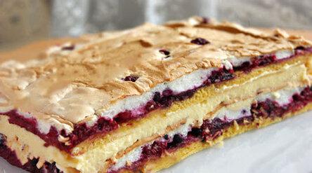 3. Любые ягоды (в оригинале варенье) рассыпать по всей поверхности теста.4. 4 белка (один белок останется от крема) взбить с сахарной пудрой. Добавить крахмал, перемешать.