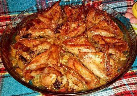 Затем в форму для запекания налить 2 ст.л растительного масла, на масло выложить замаринованный лук, поверх лука выложить крылышки и запечь в духовке при 200 градусах 1 час.