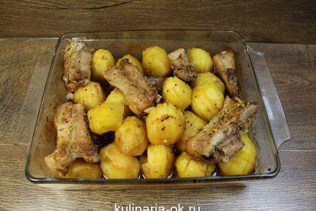 Ребра переложите в форму для запекания. Оставшийся маринад немного досолить, отправьте туда картофель и хорошо перемешайте. Картофель поместить между ребрами. Полейте сверху оставшимся маринадом.