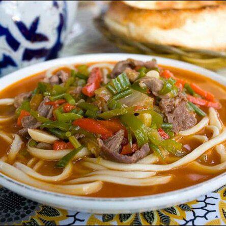 Лапшу отвариваем, перекладываем в дуршлаг, обдаем подсоленным крутым кипятком и даем воде стечь. Лагман из говядины подаем в глубокой тарелке, в которую выкладываем лапшу, заливаем соусом и посыпаем рубленой зеленью петрушки.