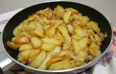 Когда картофель покроется румянцем, добавьте нашинкованный лук и 70 г сливочного масла, посолите. Достаточно 7-8 минут и картофель готов.