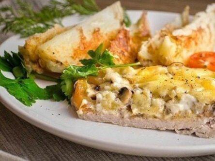 Мясо по-купечески с грибами — это очень вкусный рецепт приготовления запечённой свинины. Мясо получается очень сочным и нежным. Готовится в духовке всего 20-25 минут. В качестве гарнира к блюду подойдет что угодно, например – картофельное пюре, или вкусная вермишель. Тем же, кто на диете, достаточно будет легкого овощного салата, так как мясо очень сытное и много его съесть не получится.
