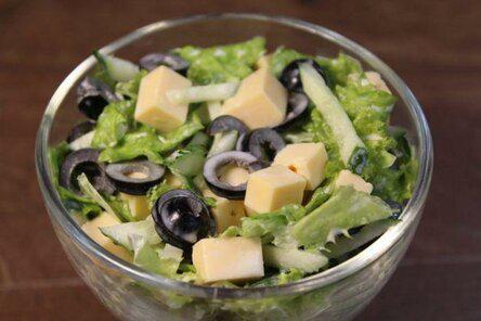 Огурцы порежьте соломкой, маслины кольцами, сыр кубиками, а салат порвите на куски.