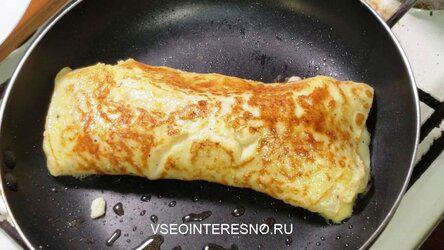 Выкладываем на одну сторону блина сосиску и заворачиваем в блинчик и сдвигаем ее на один край. На второй край наливаем пару ложек взбитой массы, посыпаем сыром, накрываем крышкой. Делаем таким образом до тех пор, пока не закончится взбитое яйцо и тертый сыр.