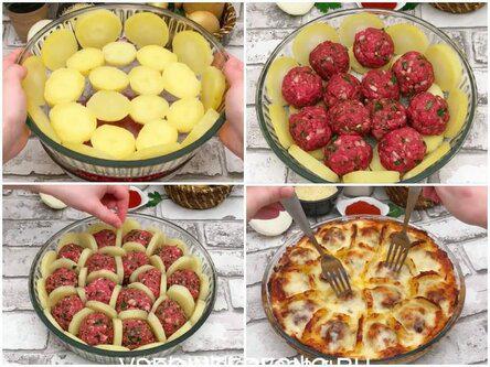 Из фарша формируем фрикадельки и кладем их на кружки из картофеля. Затем берем оставшиеся картофельные кружочки и отделяем ими мясные шарики друг от друга. Заливаем все подготовленным соусом.
