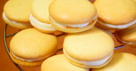 - Наполните смесью кондитерский мешок и отсадите крем на бисквиты, смазанные джемом. Сверху накройте пустыми бисквитными половинками.