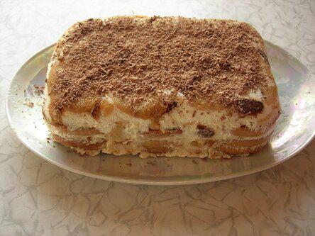 - Обильно смажь форму сливочным маслом, ровным слоем уложи в нее печенье, предварительно смоченное в крепком кофе. Промажь полученным кремом. Выложи следующий слой.