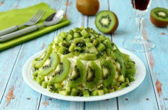 Этот салат сытный и вкусный, кусочки киви напоминают изумруды.