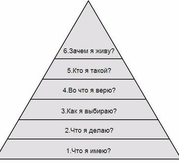 Роберт Дилтс, один из наиболее известных экспертов-разработчиков в нейро-лингвистическом программировании (лично я нежно люблю его за разработки для писателей и журналистов), предложил удобную для описания Вашей жизни модель в виде пирамиды.
