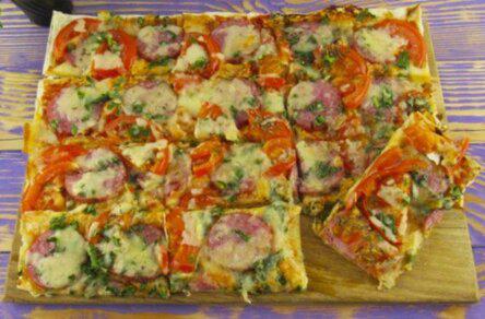 6. Раскладываем слой колбасы, затем раскладываем помидоры, посыпаем зеленью, итальянскими травами и засыпаем сыром.