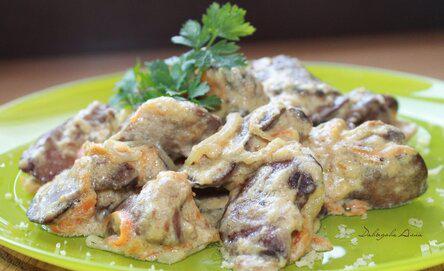 Печень режем на кусочки и жарим 5 минут.