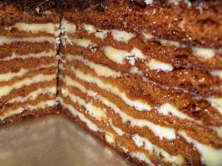 Постепенно, помешивая, добавляем муку. Тесто получится жидковатым, как на кекс. Не пугайтесь. Кастрюльку с тестом накрыть крышкой и убрать в холодильник на 8-12 часов. Постояв, тесто немного загустеет. Тесто я делала с вечера, а утром уже выпекала коржи.