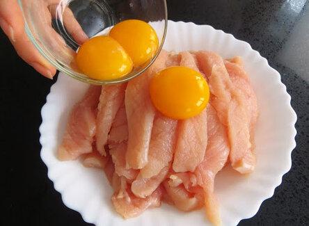 Далее нужно взять яйца и отделить белки от желтков. Есть много способов провести данную процедуру, каждый выбирает, что для него лучше. Отделенные желтки добавляются в приправленное мясо и хорошо перемешиваются. В таком виде филе должно промариноваться около получаса. Затем добавляется крахмал и еще раз все перемешивается.