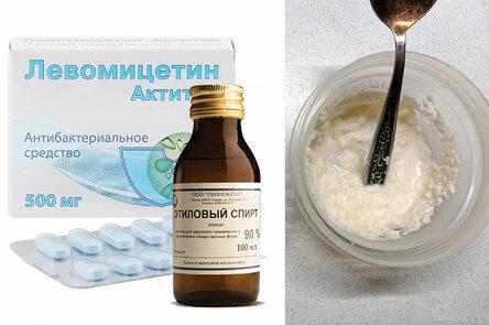 Налить в емкость (примерно такую же, как баночка спирта) 50% спирта и 50% воды и всыпать порошок Левомицетина.