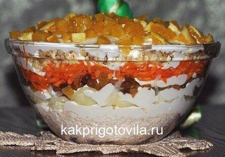 Каждый слой салата смазывайте майонезом. Сверху салат украсьте нарезанным апельсином. Перед подачей дайте салату настояться несколько часов в холодильнике.