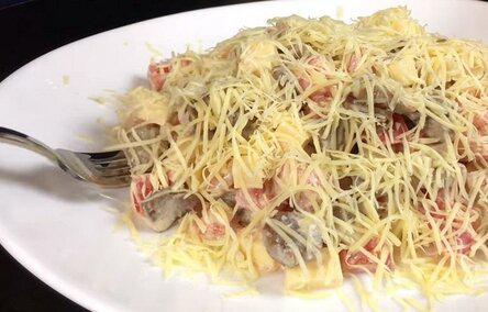 Совет. Для заправки салата рекомендую использовать домашний майонез или густой сметанный соус. Готовый салат выкладываем на сервировочное блюдо, сверху посыпаем сыром, натертым на мелкой терке. Можно подавать к столу!