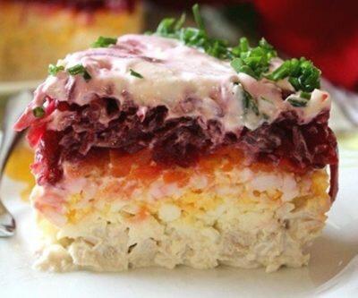 Уложить слоями: мясо, сыр, яйца, морковь, свёклу, каждый слой смазать тонким слоем майонеза.