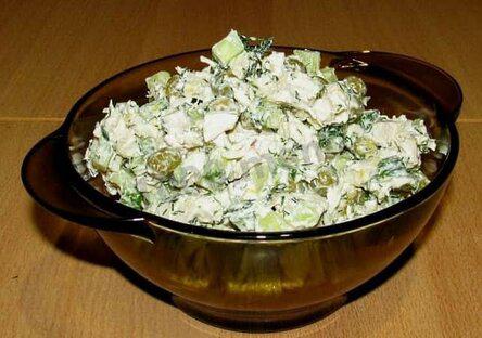 4. Сложить в салатник филе, огурцы, укроп, горошек.