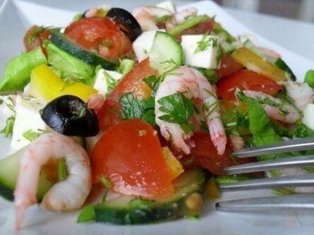 Креветок обдаем кипятком и очищаем от панцирей. Нарезаем не слишком мелко помидоры. Помещаем их в салатную емкость, добавляем нарезанный соломкой перец, а также ломтики огурцов. Маслины нарезаем колечками и добавляем к остальным продуктам.