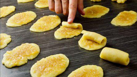 4. От теста отделите комочек около 30 г (должно получиться около 40 шариков) и скатайте шарик. Из шарика, с помощью скалки, раскатайте язычёк, выложите начинку и разровняйте. Скрутите трубочку.