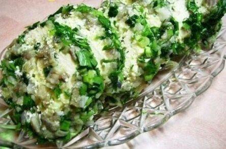 Для этого нарежем зелень. Очень вкусна смесь из укропа, петрушки и зеленого лука. Отрезаем и расстилаем на столе кусок пищевой пленки. Высыпаем на пленку нарезанную зелень в форме квадрата или прямоугольника. На зелень раскладываем нарезанное филе сельди. И так же на сельдь раскладываем сверху «крем». Пытаться намазывать эту смесь нет смысла, так как кусочки сельди будут «прыгать» и расползаться со своего места. Ну, а теперь нужно при помощи пленки аккуратно свернуть все в рулет. Спешить не нужно. Каждый виток стараемся завернуть по плотнее и по всей длине рулета через пленку выравниваем и прижимаем его рукой.