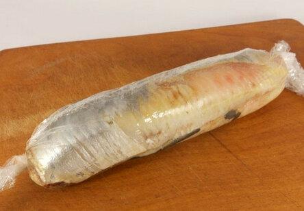 Аккуратно заверни сельдь в плотный рулет, помогая себе пищевой пленкой.
