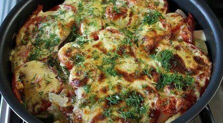 Взять глубокую сковороду или противень, выложить овощи: сначала картофель, потом лук, кабачки, помидоры. Каждый слой немного посолить. Я использовала специальную смесь «Вегетта».