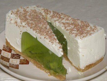 Скажу честно, когда желе из киви не получилось, мне хотелось бросить эту затею, но я рада, что довела рецепт до конца. Мои домашние и зашедшие вечером гости были в шоке вначале от необычного вида торта, а потом и от вкуса. Он получился очень нежным и воздушным, кисло-сладким на вкус. Когда доедаешь кусочек, реально понимаешь, что еще один в тебя не влезет.