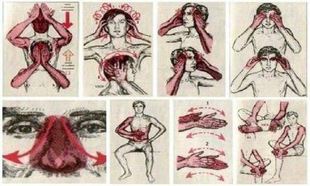 Дальше кладем правую ладошку на лоб, левую сверху и начинаем потирающие движения от виска к виску. Можно не касаться руками лба, делать на расстоянии несколько сантиметров от лица. Но если вы хотите разгладить морщины на лбу, то надо касаться кожи. Делаем также за 30 секунд 30 движений. Это упражнение оздоравливает все носовые пазухи, а также активизирует работу гипофиза.